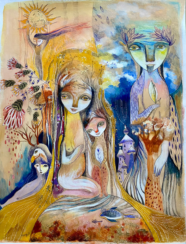 Techniques: acrylique sur papier aquarelle, collages feuilles d’or, stylo, crayons de couleurs